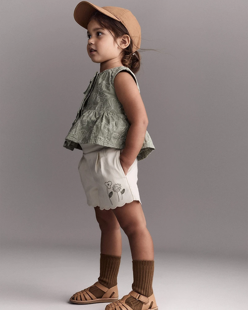 Elevate your little one’s summer style with these floral scalloped shorts. Made from soft twill, they offer breathability and comfort for all-day play. The novelty pocket lining adds a fun twist. Perfect for park outings or family brunches, these shorts blend fashion and functionality effortlessly. Dress them up or down—these versatile shorts are a must-have for every toddler's wardrobe. Toddler-friendly taglessness? No question.