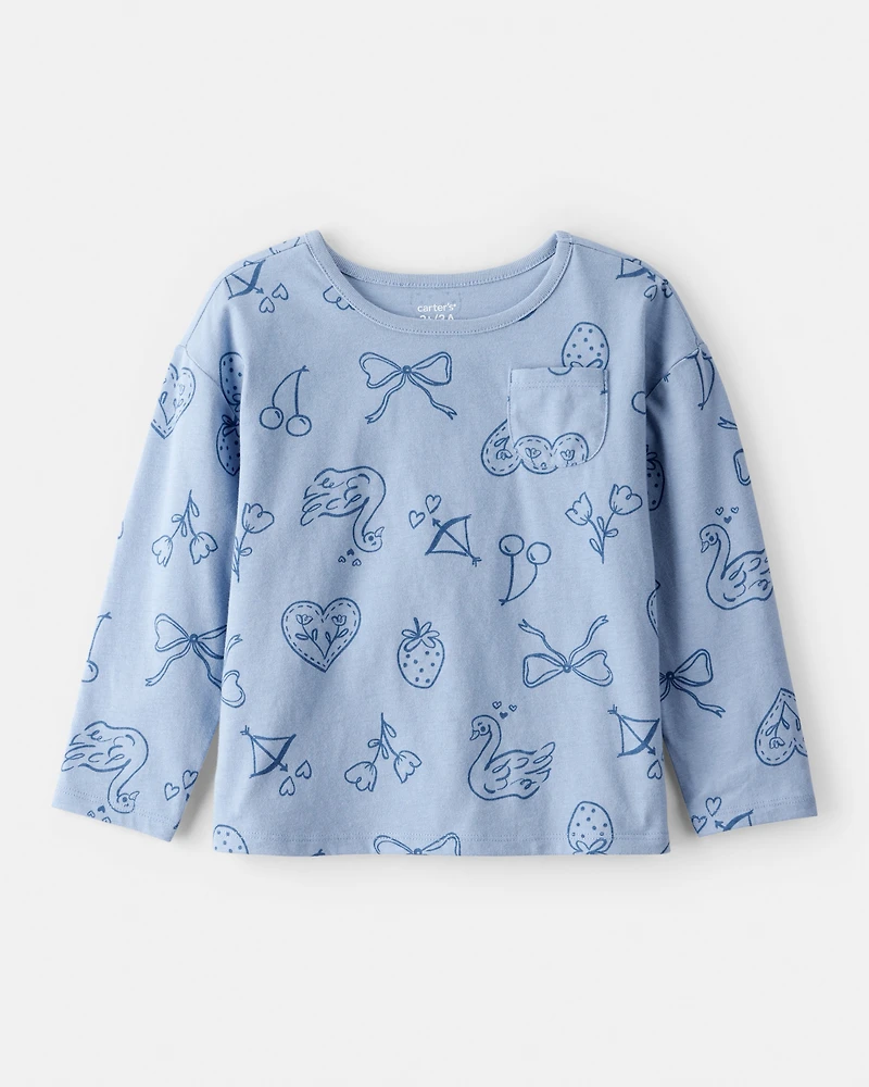 Bring a dash of fun to her day with this long sleeve top covered in icons like swans, strawberries, hearts, and bows that make every outfit stand out. The relaxed fit keeps her comfortable from playdates to park days, while the chest pocket adds an effortlessly cool touch. Designed for easy dressing and everyday wear, it’s the kind of top that makes getting ready feel fun and stylish.