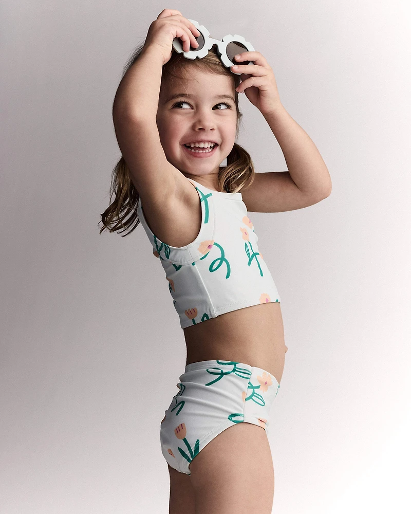 Dive into summer fun with this vibrant floral tankini set! Designed for little ones who love to splash and play, the light green fabric features a charming flower print that brightens up any beach day. With UPF 50+ protection, parents can relax knowing their little sunbeam is safe while they enjoy the sun. The tag-free design ensures all-day comfort, making dressing a breeze. Toddler-friendly taglessness? No question.