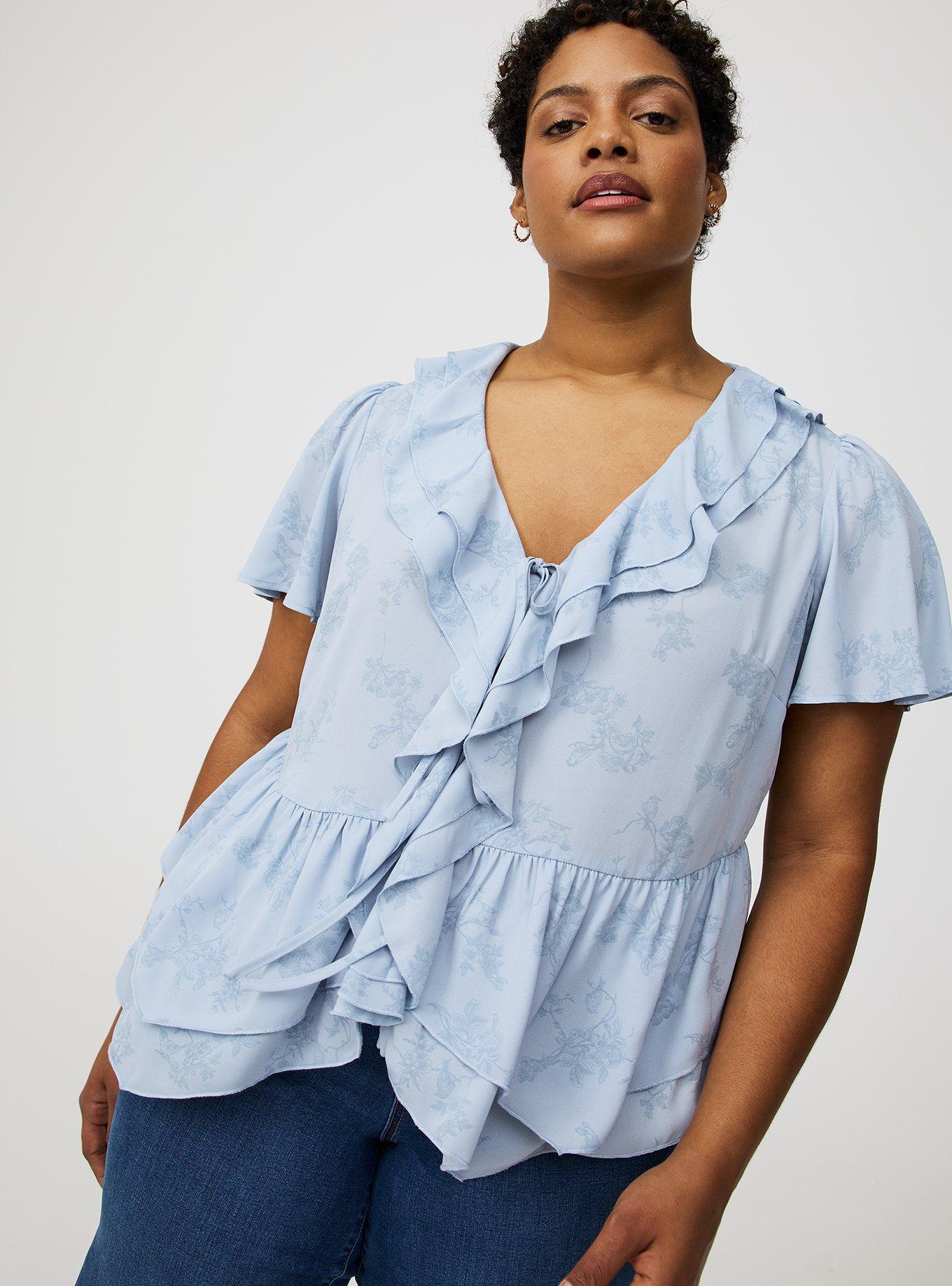 FIT Measures 30'' from shoulder (size 2). MATERIALS + CARE Georgette woven fabric. 100% polyester. Machine wash cold. Tumble dry low. Imported. DETAILS V-shaped neckline. Short ruffle sleeves. Tie front details. Tiered bottom.