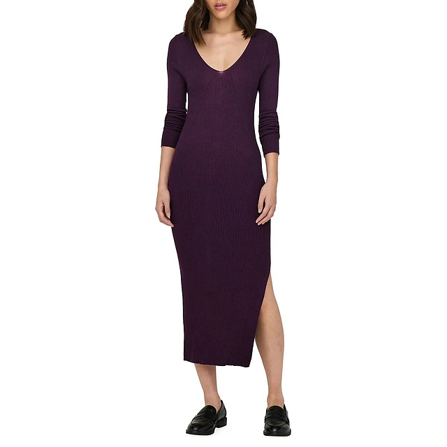Long-Sleeve V-Neck Midi Dress with High-Low Hem