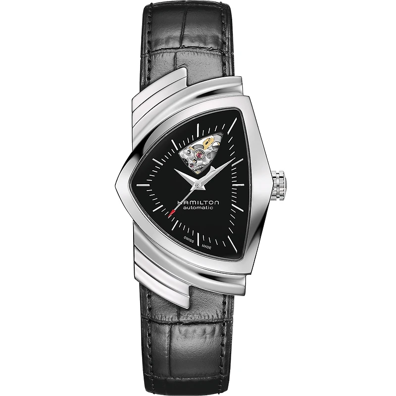 The original Ventura, launched in 1957, made watchmaking history as the world's first electrical, battery powered watch. Creating an automatic version of a watch famed for its battery powered movement is a bold move, and one that's typical of Hamilton.This model offers a glimpse of the movement inside.