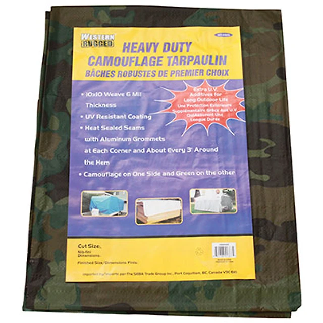 This Western Rugged 20 x 20 ft. heavy-duty camouflage tarp is an all-purpose solution for protecting your belongings and keeping them dry from rain. It's made of woven, waterproof, and UV-resistant polyethylene material that's built to withstand all seasons. Cover your woodpile, boat, truck, tent, and more with the confidence that comes with a Western Rugged tarp. | Western Rugged Tarp 20 x 20 ft. - Camouflage
