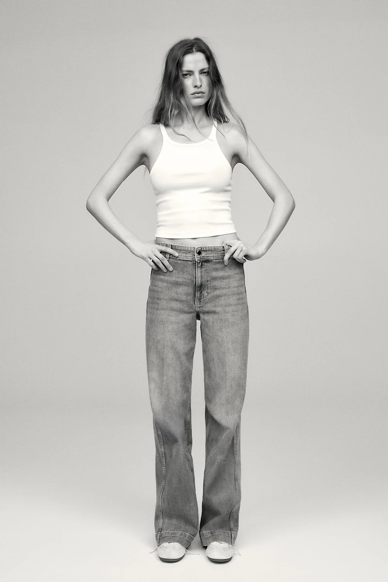 Jeans in cotton denim with gentle stretch for good comfort. Regular fit from waist to hip and wide cut from thigh to hem. High waist, zip fly with button, patch back pockets, and creases at front and back. Wide, regular-length legs, designed to fall at top of foot with little or no stacking. Effortlessly flattering no matter how they're styled.