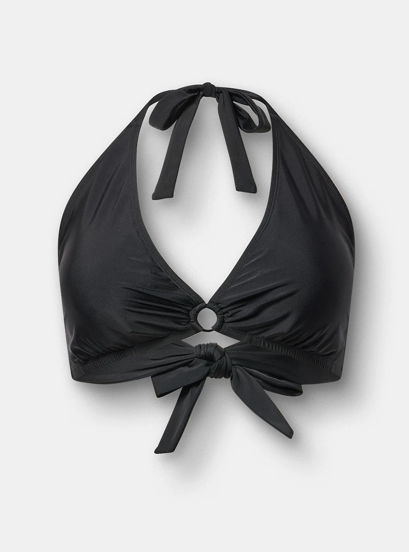 FIT Low coverage. Modesty pads. MATERIALS + CARE Nylon-blend knit fabric. 80% nylon, 20% spandex. Machine wash cold. Line dry. Imported. DETAILS Halter neckline. Sleeveless. Self tie at back. O-ring detail.