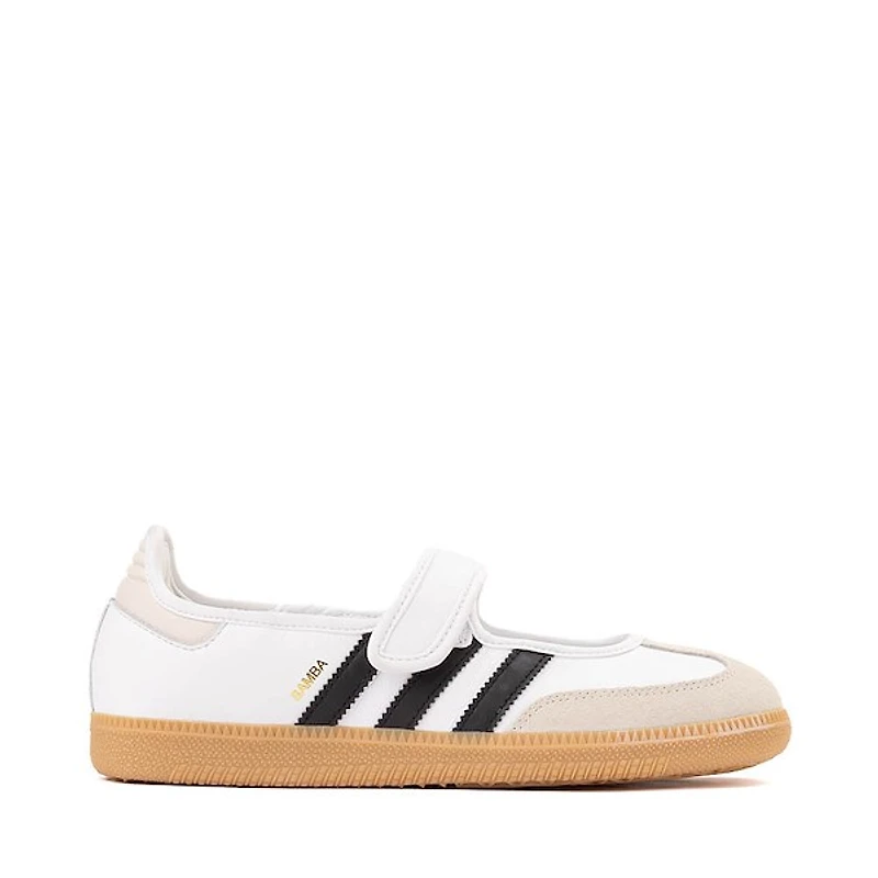 Give your sporty style a modern makeover in the new samba jane by adidas. Sporting a mary-jane-inspired silhouette, this unique samba features a mix of smooth leather and suede uppers with a soft satin lining, hook-and-loop strap, and grippy gum rubber sole.