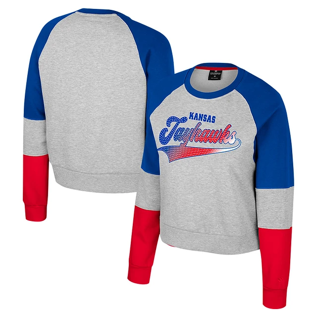 Women's Colosseum Heather Gray Kansas Jayhawks Katinka Rhinestone Scoop Neck Pullover Sweatshirt
