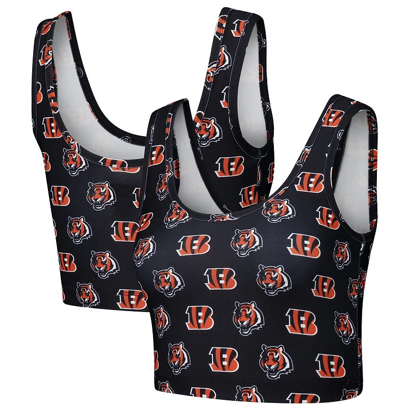 Rep the Cincinnati Bengals from head to toe with this Concepts Sport Record Allover Print Bralette. The soft and stretchy fabric blend provides the perfect amount of comfort and support whether you're watching the game from the couch or cheering on the Bengals from the stands. With its classic bralette silhouette and allover Bengals print, this piece makes it easy to show your team spirit.