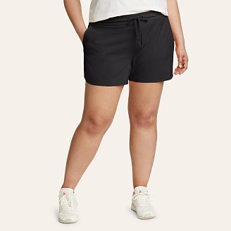 The Flexion stretch-woven polyester/spandex fabric and an elastic/drawstring waist give these 4" pull-on shorts an added dimension of comfort. Lightweight and easy packing, they feature moisture-wicking and sun-protection technology, plus two slash side pockets and one secure zip back pocket.Models shown are 5'9" to 5'11" tall, wearing size S/4, L/12, or XXL/18.