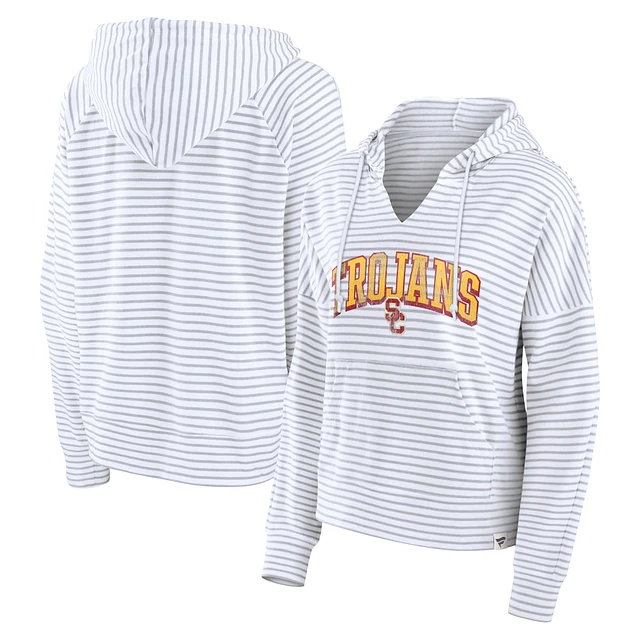 Women's Fanatics White/Gray USC Trojans Arch Logo Striped Notch Neck Pullover Hoodie