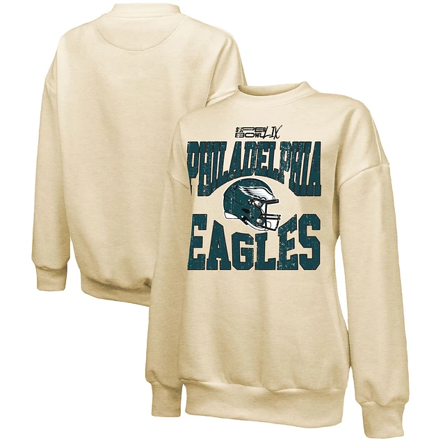 Women's Majestic Threads Cream Philadelphia Eagles Super Bowl LIX Fadeaway Helmet Oversized Tri-Blend Pullover Sweatshirt