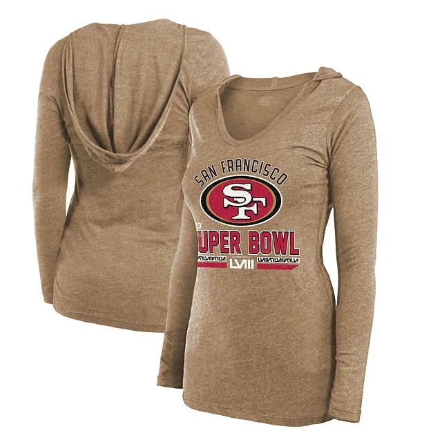 Women's Majestic Threads Gold San Francisco 49ers Super Bowl LVIII Hard Court Lightweight Tri-Blend Long Sleeve V-Neck Hoodie T-Shirt