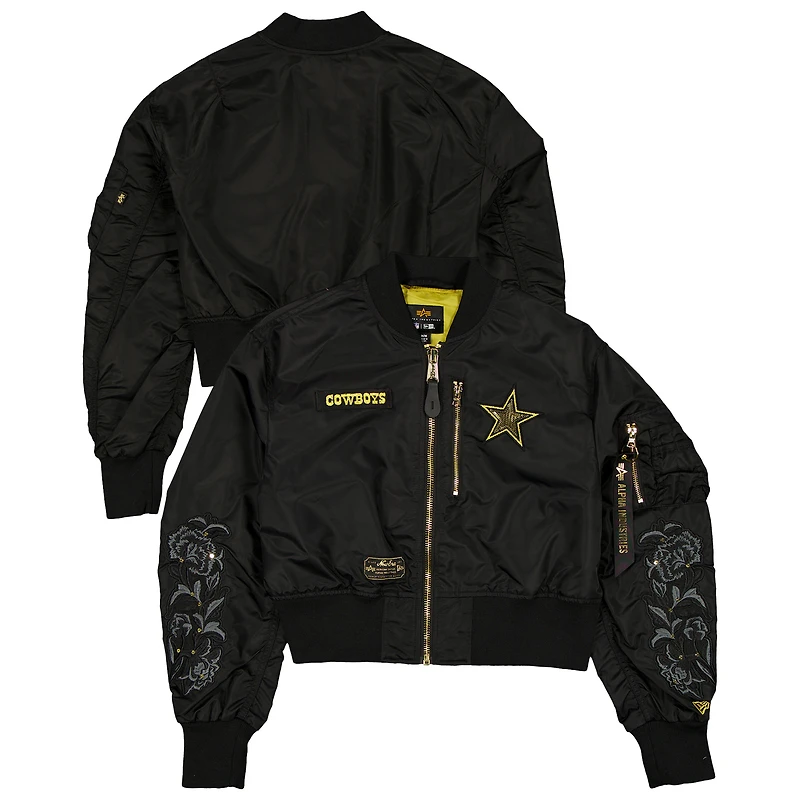 Alpha Industries has a long and storied history of crafting high-quality outerwear for the U.S. military and fashion-forward consumers alike, making this New Era collaboration a must-have. This luxurious Dallas Cowboys Full-Zip Crop Jacket has a cropped silhouette that sits perfectly at the waist, creating a chic and contemporary look. Featuring embroidered floral details down each sleeve and a team patch on the chest with a sequin logo, this lightweight jacket exudes a chic, modern aesthetic. The rib-knit collar, cuffs, and hem provide a snug, comfortable fit, while the multiple zippered pockets offer secure storage for your essentials. Level up your look and let everyone know who you rep by adding this jacket to your Dallas Cowboys wardrobe.