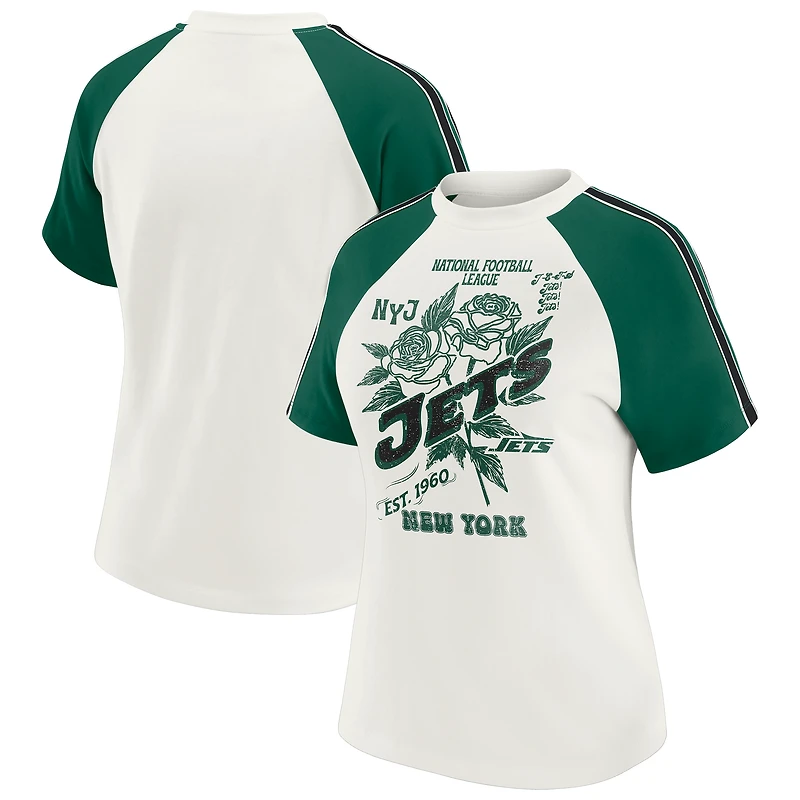 Showcase your New York Jets pride with this Sleeve Stripe Distressed Raglan T-Shirt from WEAR by Erin Andrews. The distressed screen print graphics give it a vintage look that adds a touch of timeless style. The contrast-color sleeve stripes and raglan sleeves make this t-shirt a unique addition to your New York Jets collection.